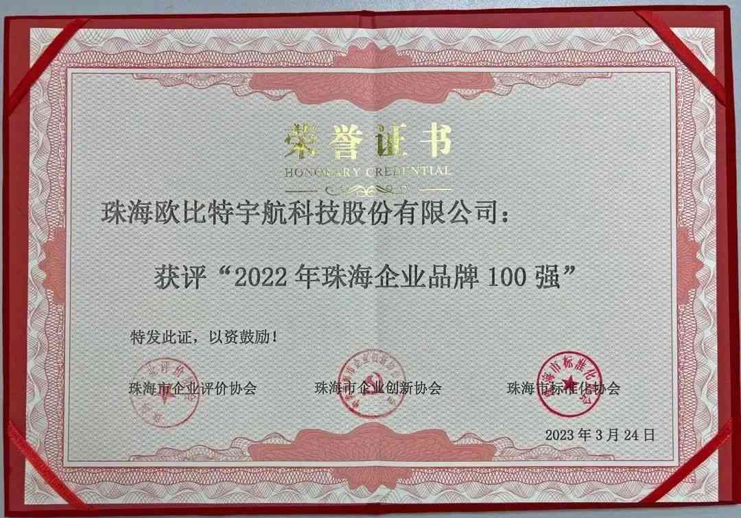3月24日,由珠海市企业评价协会、珠海市标准化协会、珠海市创新协会主办,广东慧权科技咨询有限公司承办的2022珠海品牌100强发布会举行。会上,珠海市企业评价协会会长徐金凯宣读了2022珠海品牌100强、2022珠海新锐品牌、2022珠海老字号榜单,并为上榜企业代表颁发荣誉证书。珠海欧比特宇航科技股份有限公司荣登2022珠海企业品牌百强榜单。