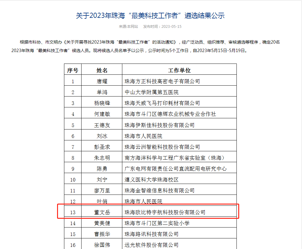 活动期间进行了2023年珠海市最美科技工作者颁奖仪式。珠海欧比特综合电子事业部部长董文岳荣获2023年珠海“最美科技工作者”荣誉称号!副市长李翀为他颁发了荣誉证书。