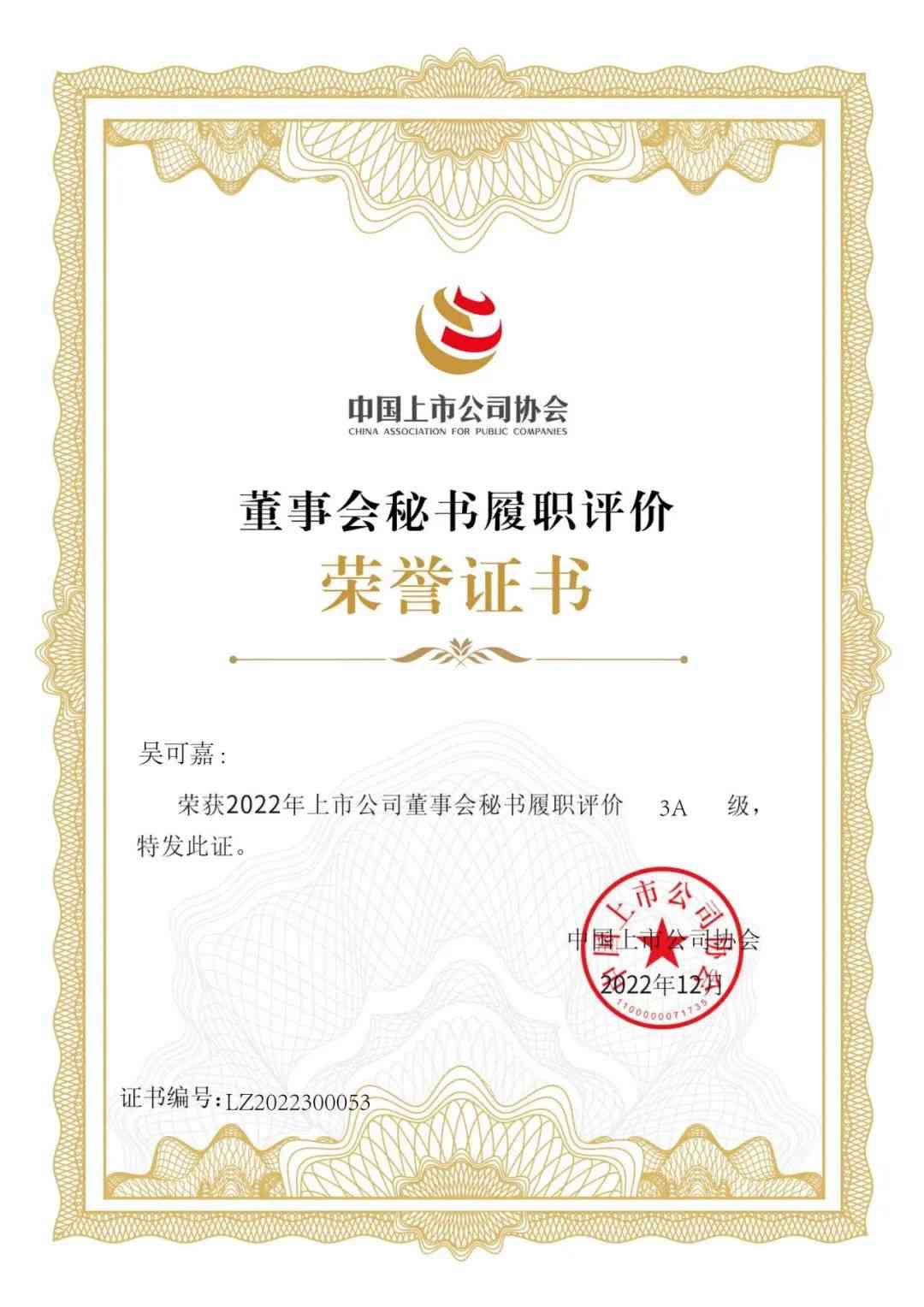 中国上市公司协会“2022上市公司董事会秘书履职评价”结果于近期发布,航宇微董秘吴可嘉荣获2022年上市公司董事会秘书履职评价3A级荣誉。