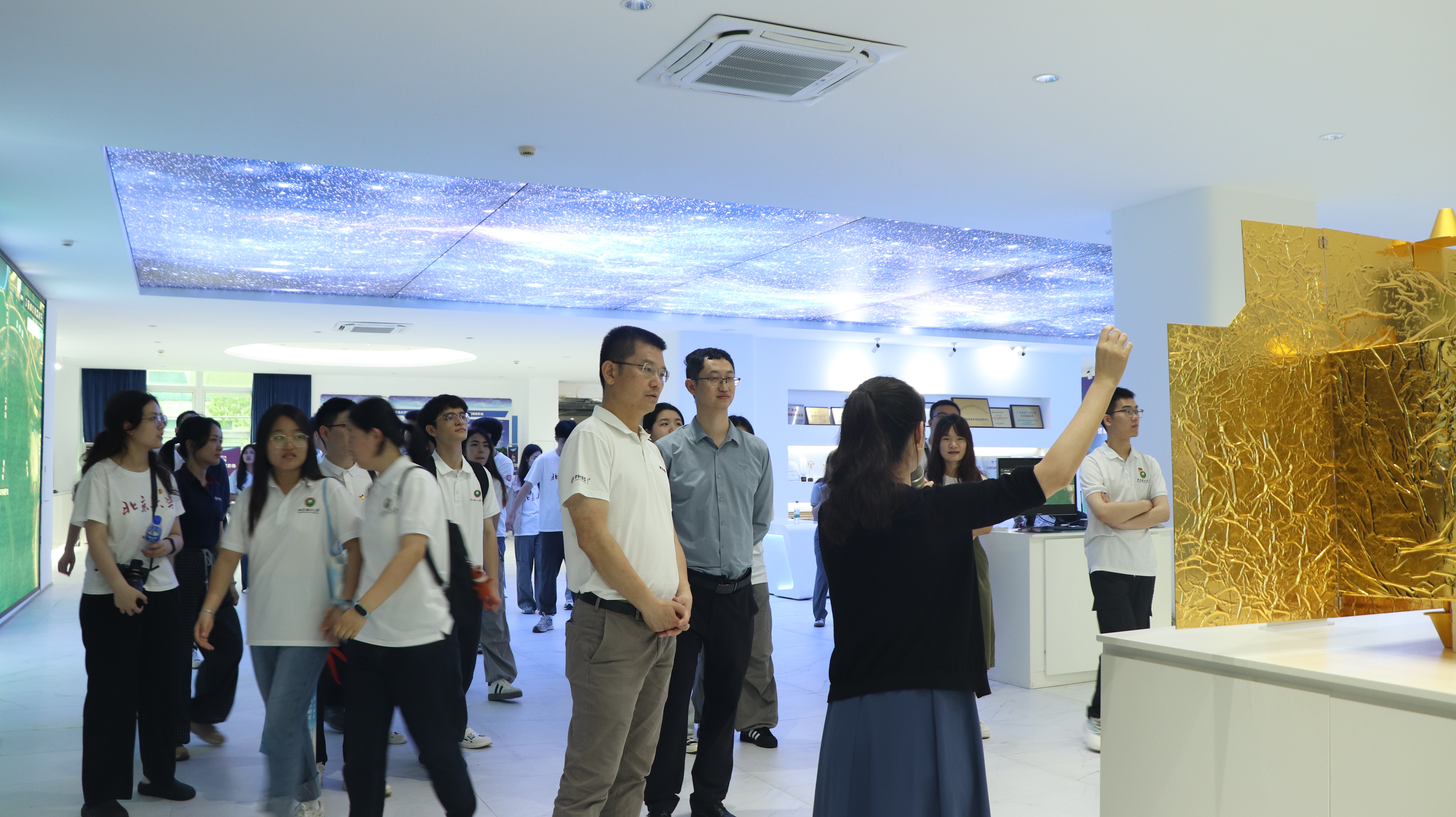 在航宇微企划品牌部经理周娜的带领下,师生们首先参观了公司展厅。通过近距离观察“珠海一号”卫星模型、卫星运行轨道演示及遥感影像展示,大家深入了解了航宇微在商业航天领域的卓越成就。特别是在宇航电子和人工智能展区,师生们对国产化航天芯片的研发历程和关键技术突破赞叹不已,深刻体会到科技创新对国家发展的战略意义。