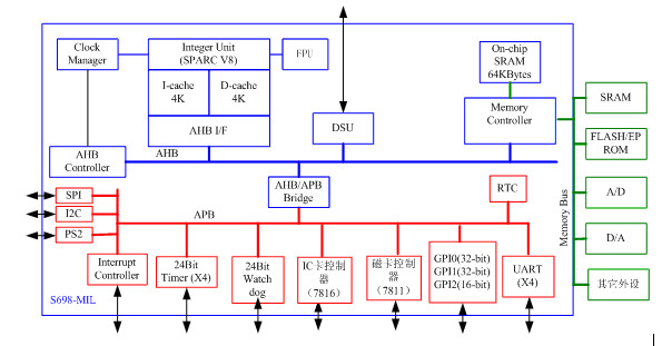 S698-MIL内部配置了32位整数处理单元(IU),32/64位浮点处理单元(FPU)。片内采用32位AMBA 2.0标准总线作为系统架构总线,外部总线支持8位、16位、32位。AMBA总线配置了80个GPIO口(GPIO0是32位,GPIO1是32位,GPIO2是16位)、3路通用UART接口、1路16550兼容UART接口,4个24位定时器(TIMERS)、1个实时时钟(RTC)、1个看门狗、1个PS/2接口、1个I2C总线接口、1个SPI总线接口、1个三磁道磁卡接口,3个智能卡接口等大量外设;丰富的片上外设资源使得S698-MIL的集成度和功能得到了大幅度的提高。另外,S698-MIL还内嵌了64KBytes的SRAM。