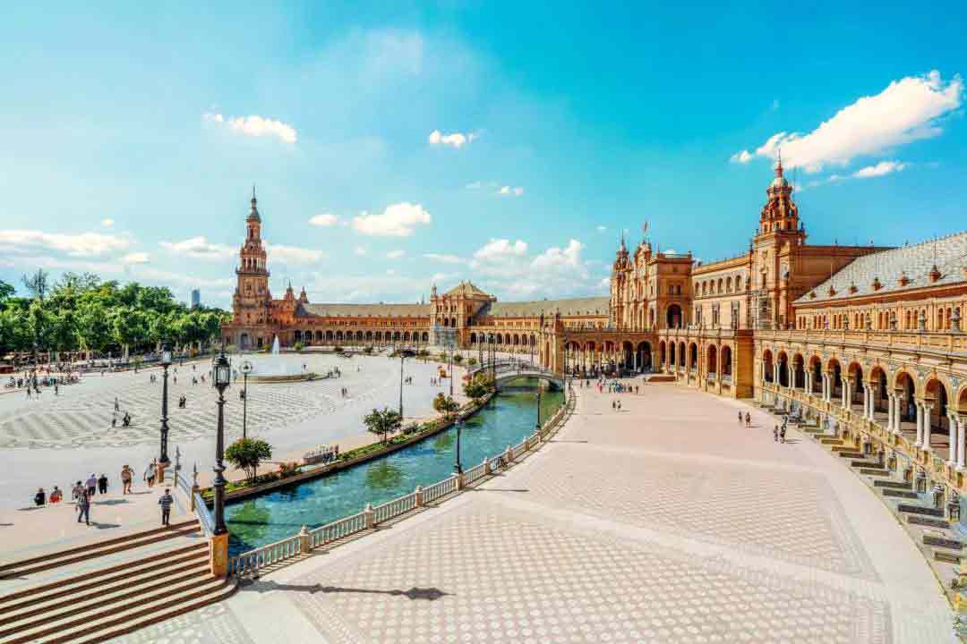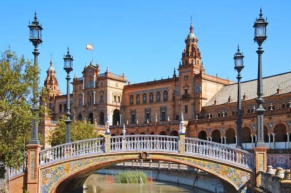 塞维利亚的西班牙广场位于城南环境幽静、气氛清新的玛利亚·路易莎公园中,其新月形的古典建筑在绿地簇拥之中别具典雅姿态。