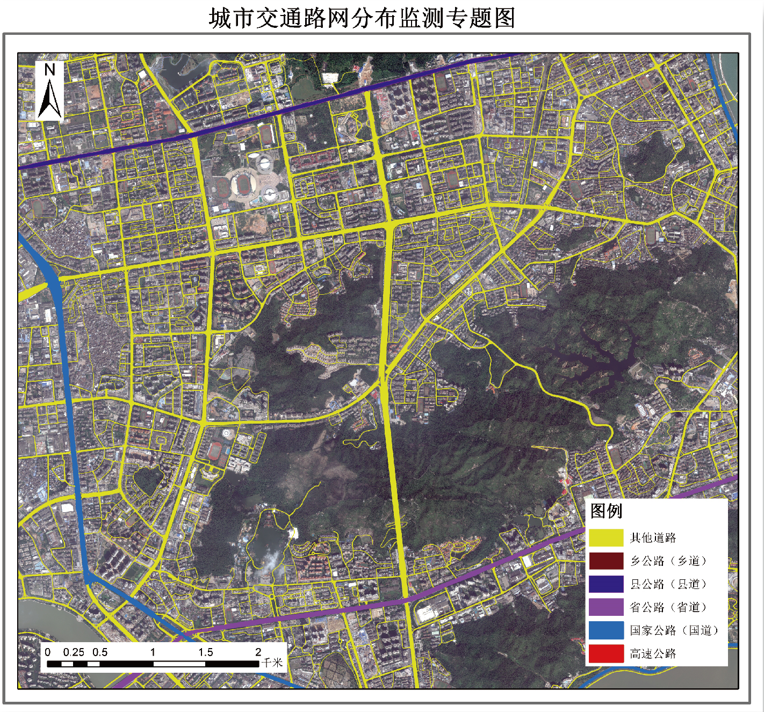 利用高空间分辨率卫星遥感影像,采用面向对象和深度学习方法,识别提取监测范围内人工修建、建成通车的硬化公路,每季度监测一次,实现公路普查和数据更新。通过监测交通路网分布情况,为交通运输局提供道路分布基础数据,摸清交通道路底数,发现交通管理存在的不足,为全市交通规划建设提供数据支持,有利于实现交通管理的常态化、精细化和信息化。