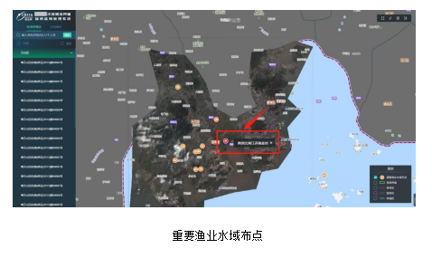 地图上点击任意一个重要渔业水域布点,地图上会出现弹框,弹框中的信息是此重要渔业水域布点的名称,同时被选中的布点图标则会标红与未选中的布点的图标区分开,以便用户可以更加明确自己选中的布点。弹框也可以选择关闭按钮,渔业布点的名称信息则会消失,渔业布点高亮的图标也会恢复。