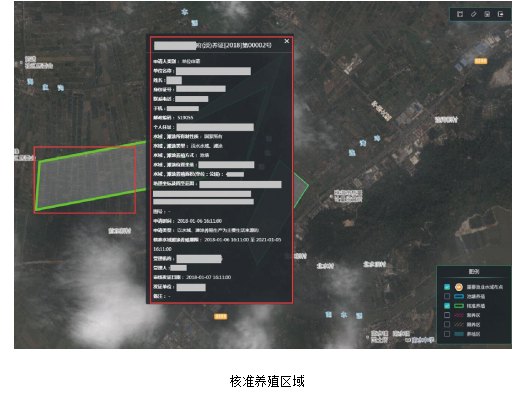地图上选中任意一个核准养殖区域,即地图上会出现弹框,弹框中的信息是此核准养殖区域的相关信息,包括编号,申请人类别,单位名称等信息,同时被选中的核准养殖区域边框则会进行加粗处理,与未选中的核准养殖区域区分开,以便用户可以更加明确自己选中的核准养殖区域。在地图上选中该核准养殖区域的同时,左侧列表数据会高亮对应的数据。同时地图也会移动到将此选中区域的中心点。弹框也可以选择关闭按钮,此核准养殖区域相关信息则会消失,左侧列表高亮数据同时消失,被选中区域边框加粗也会恢复至未被选中前。